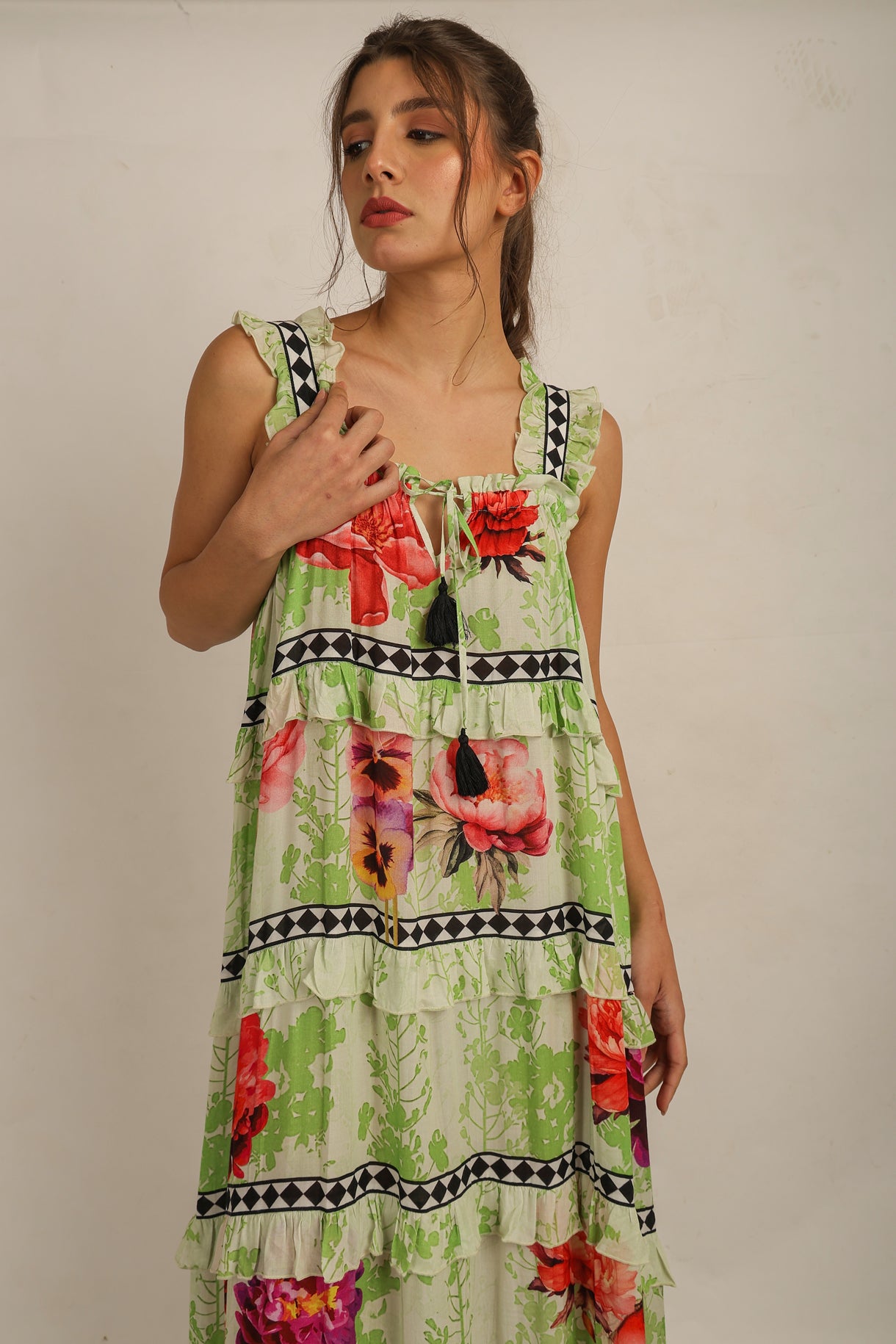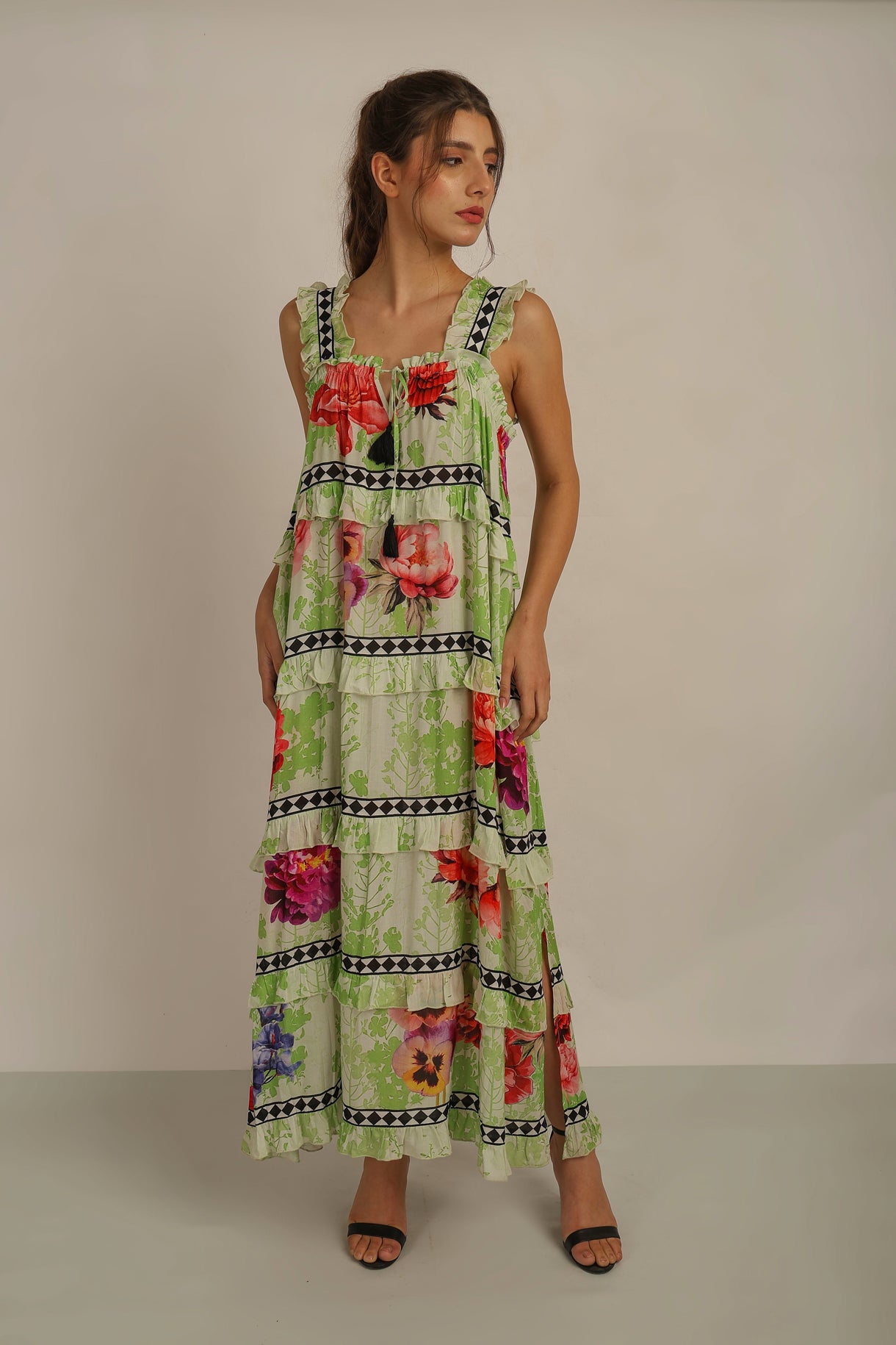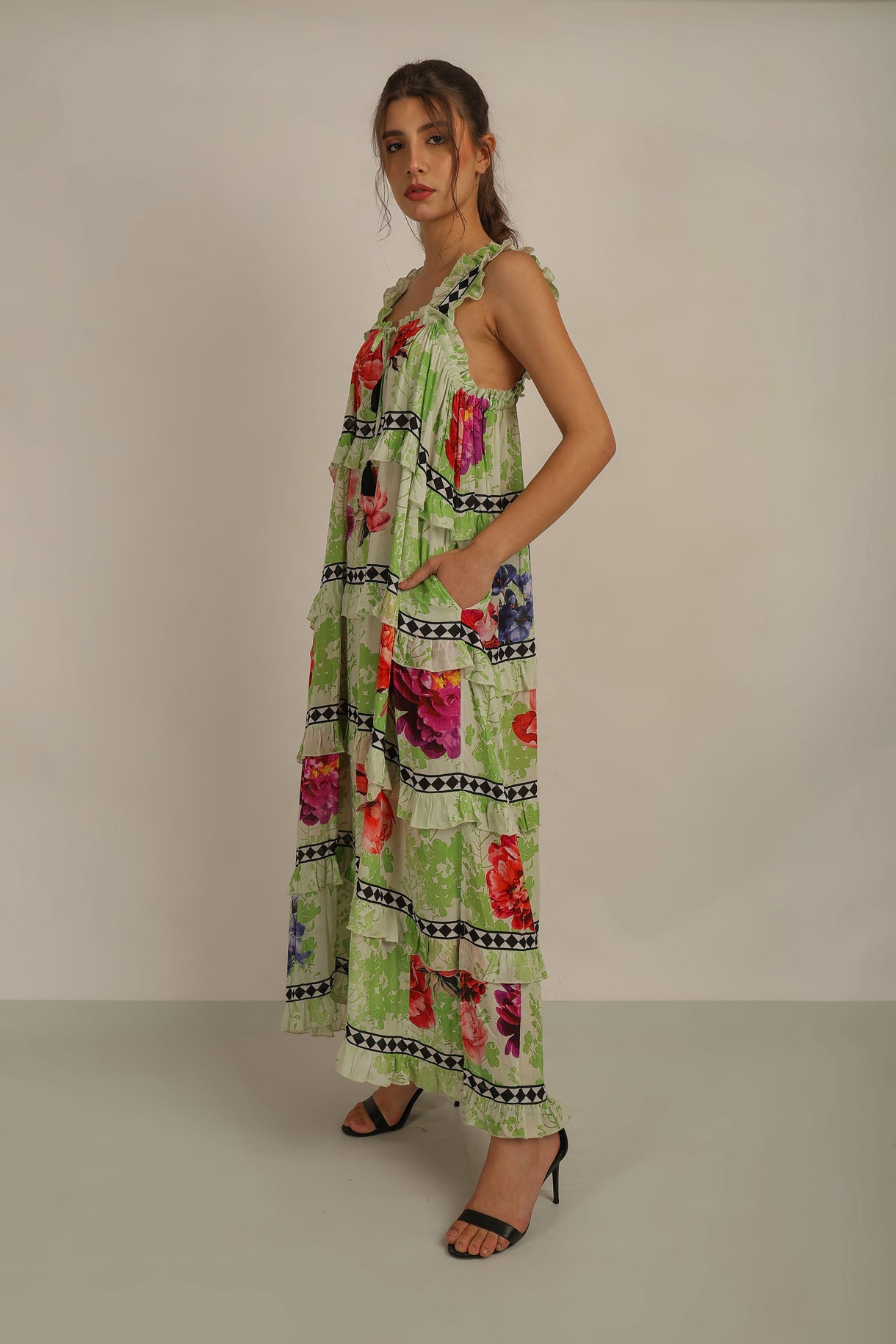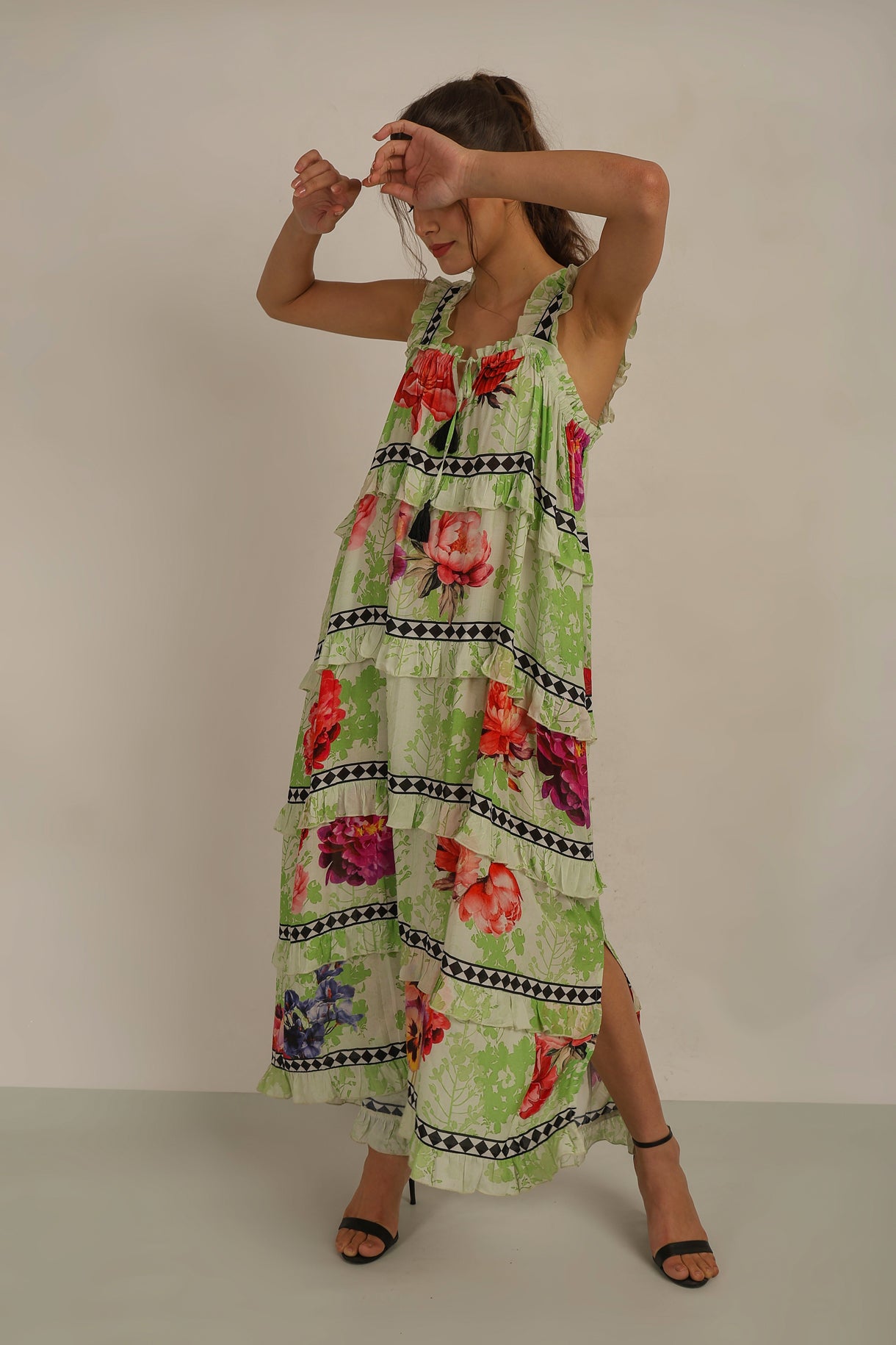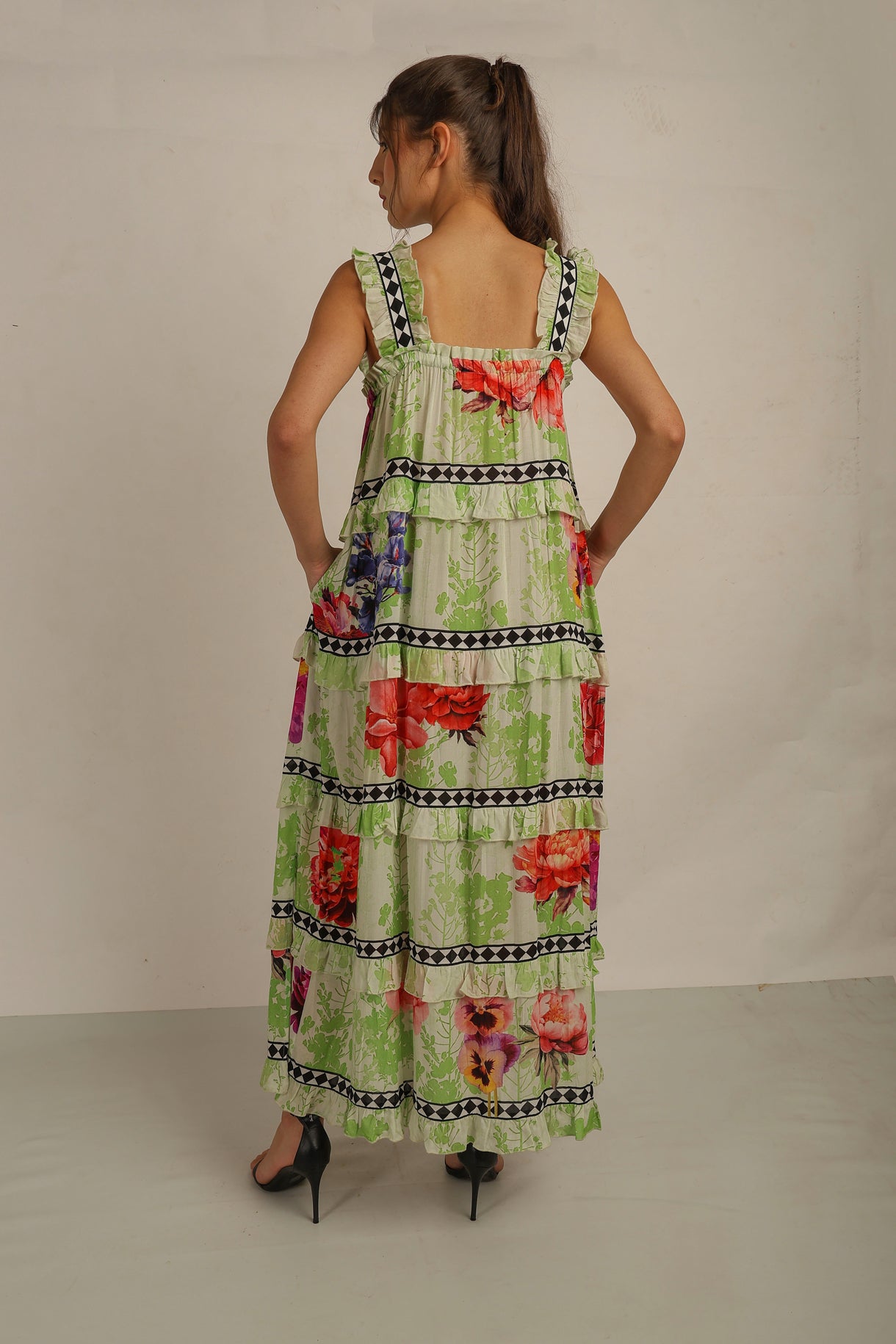 The Chloe Lina Dress features wide straps with elegant black and white trim and delicate side frills, creating a sophisticated silhouette. Its relaxed fit and easy-to-wear design make it perfect for effortless style. Showcasing a beautiful floral print, this exclusive maxi dress offers a unique blend of comfort and refined detail, ideal for any occasion.