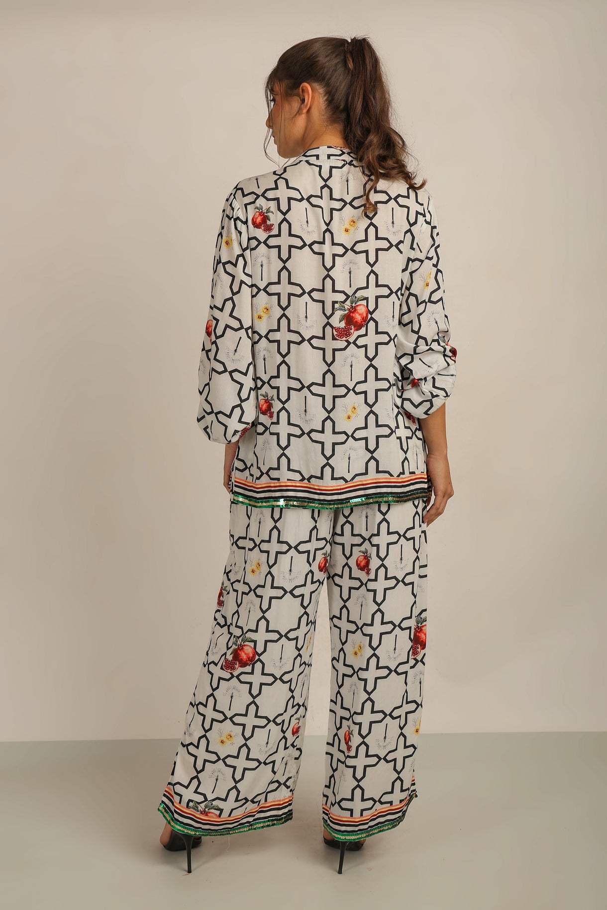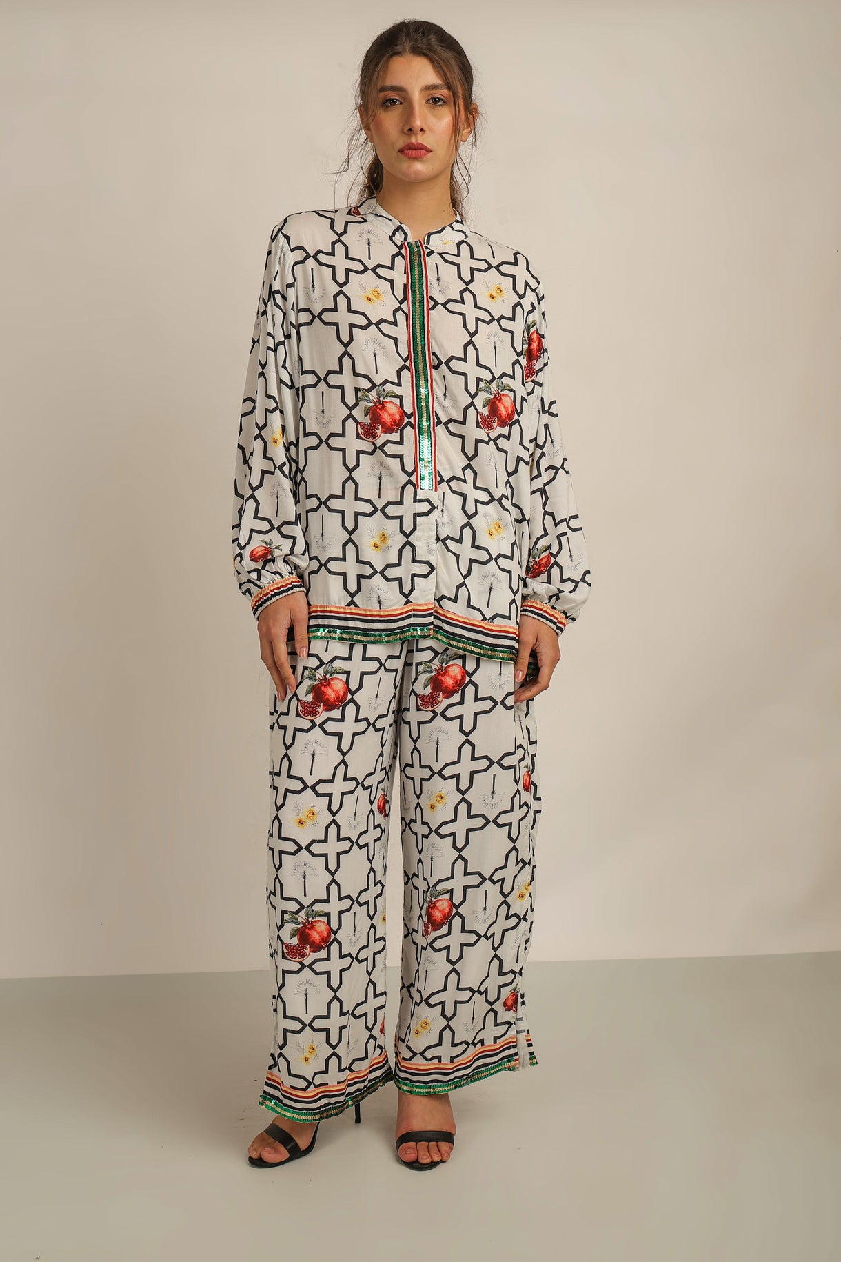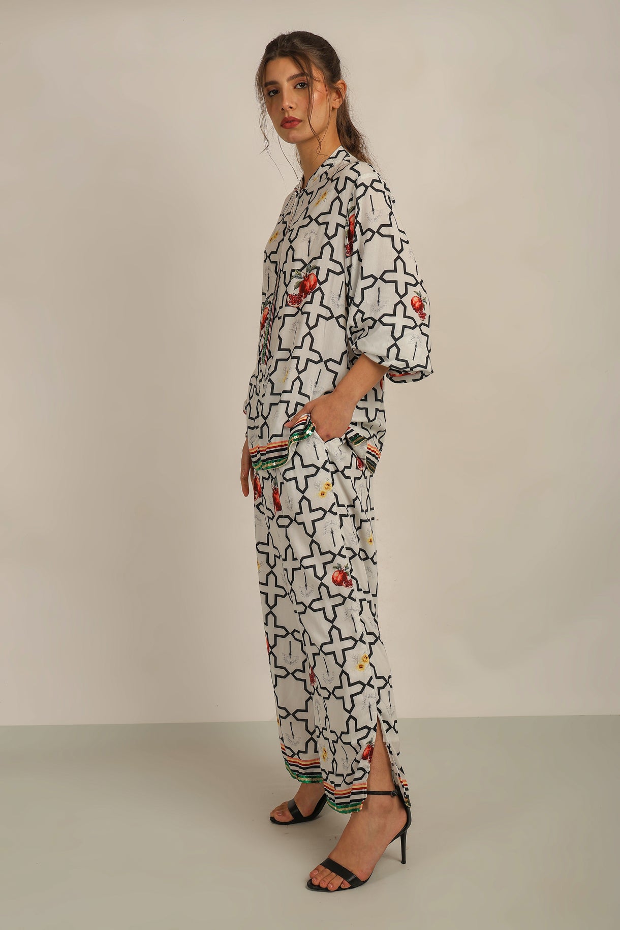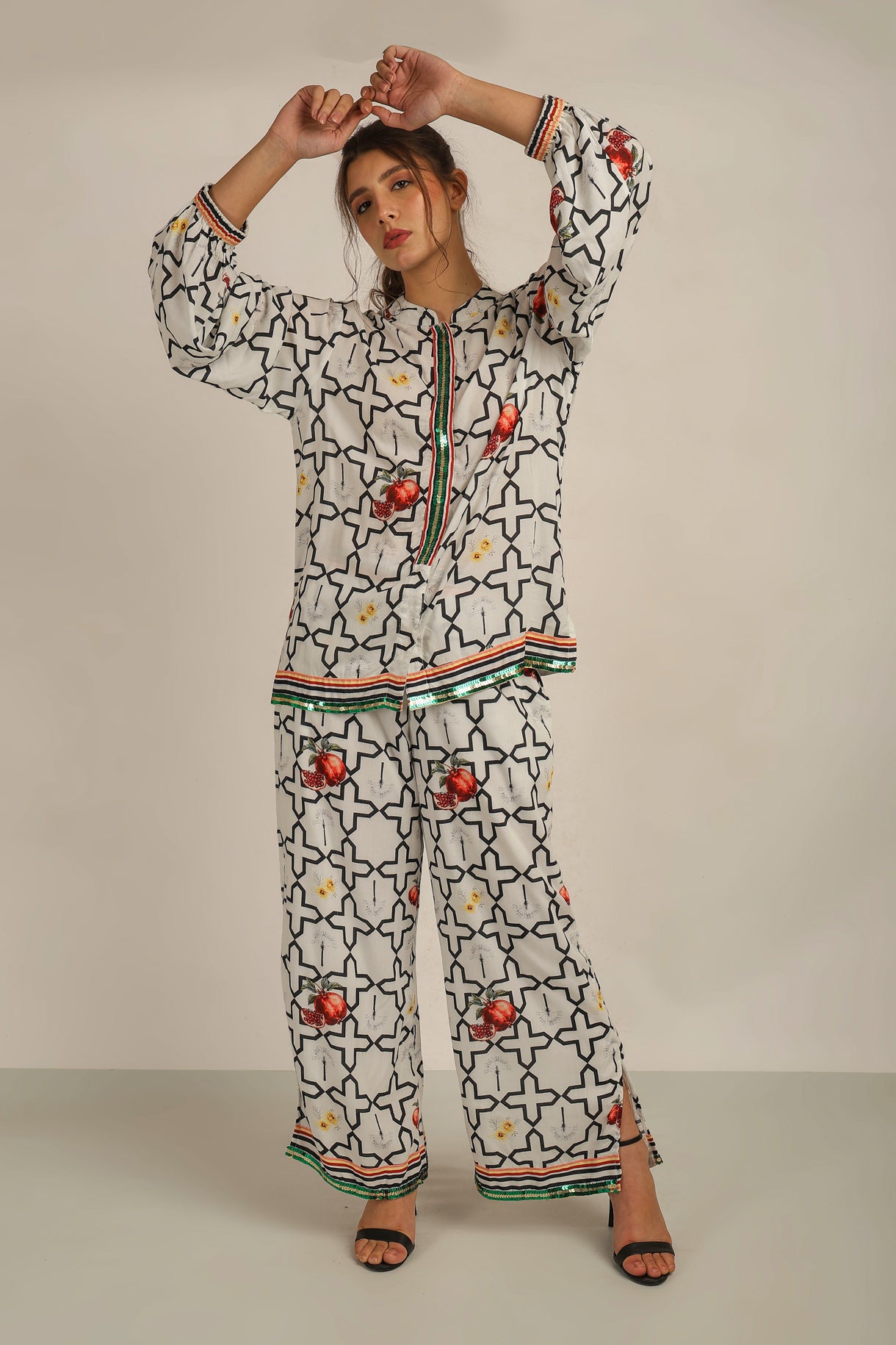 The MARRAKESH SHIRT features a unique Moroccan-inspired print that adds a touch of elegance to this classic shirt. The long sleeves provide coverage while the embellished sequin placket adds a subtle sparkle. Perfect for any occasion, this shirt is a must-have in your wardrobe.