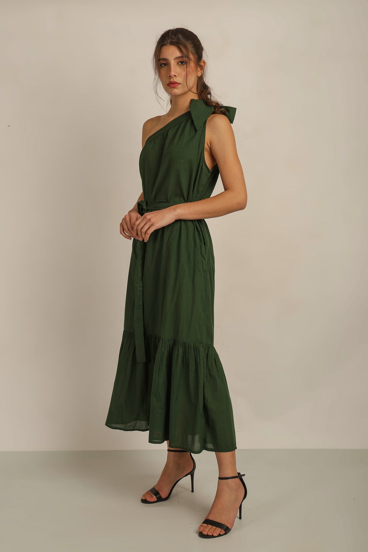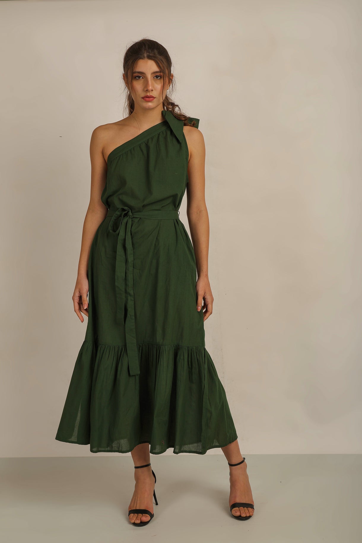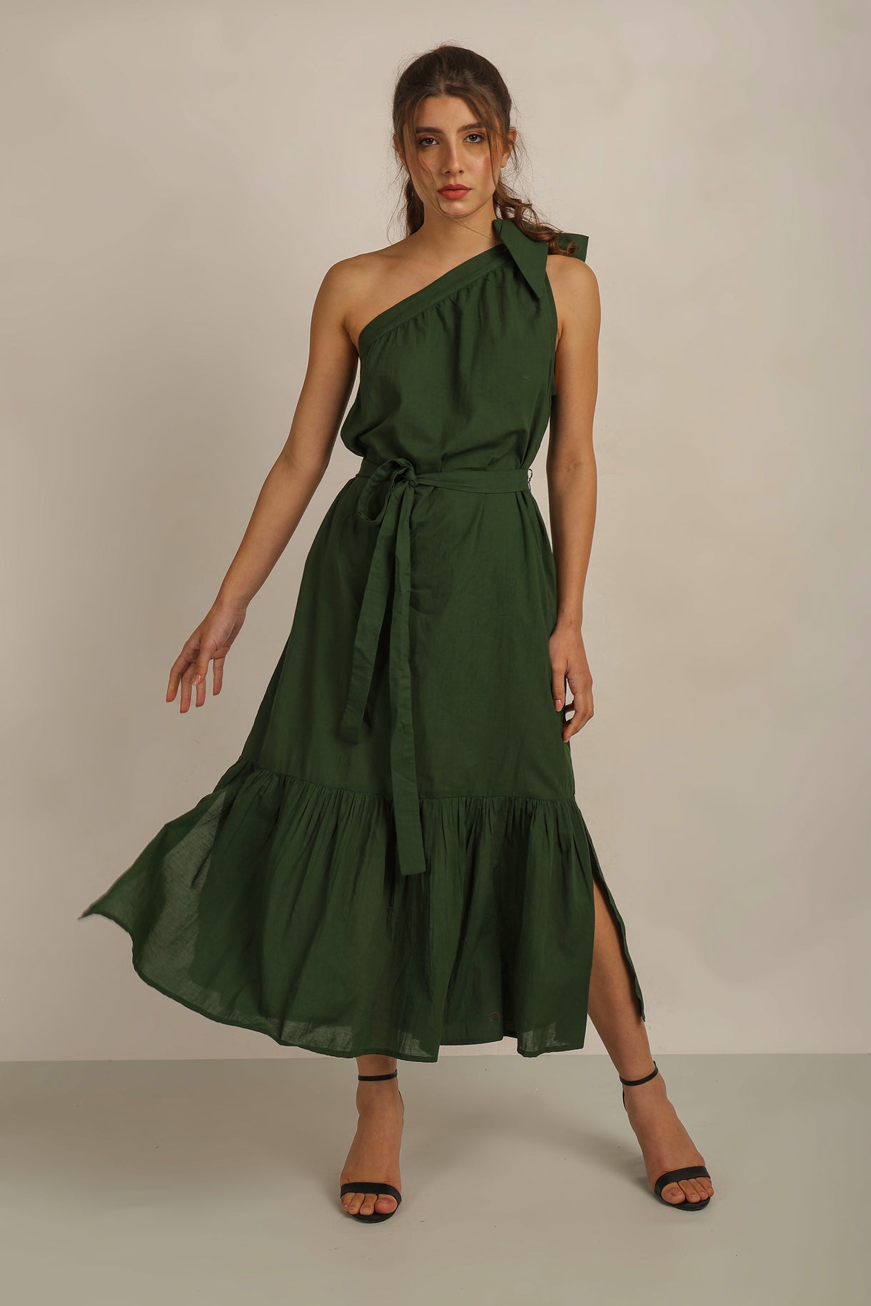 The Sammy One Shoulder Dress is a must-have for your wardrobe. This dress features a stylish one shoulder design and comes in a beautiful safe green. It's perfect for a lunch outing, Complete the look with the included sash belt.