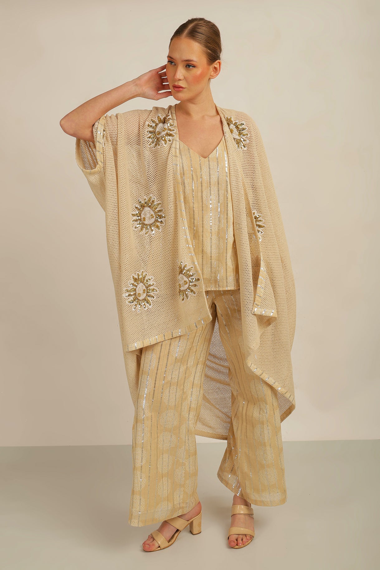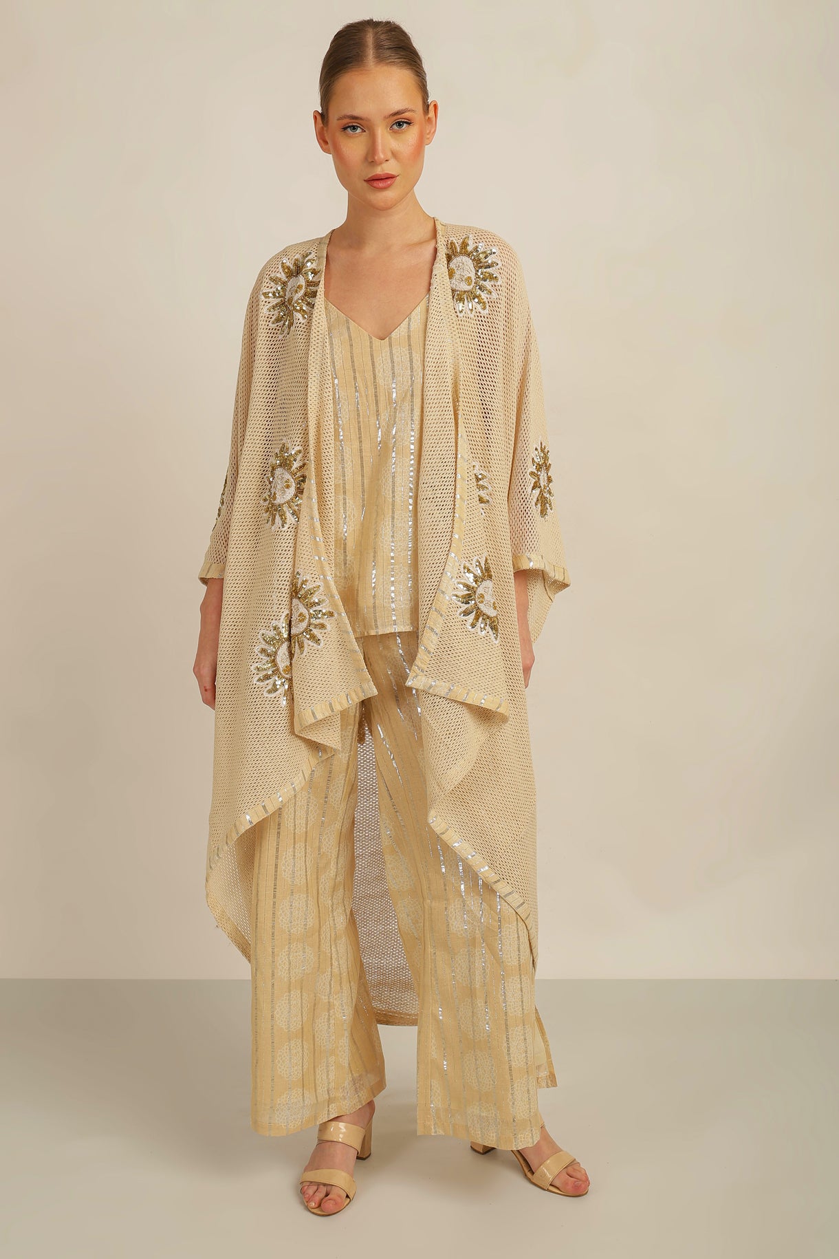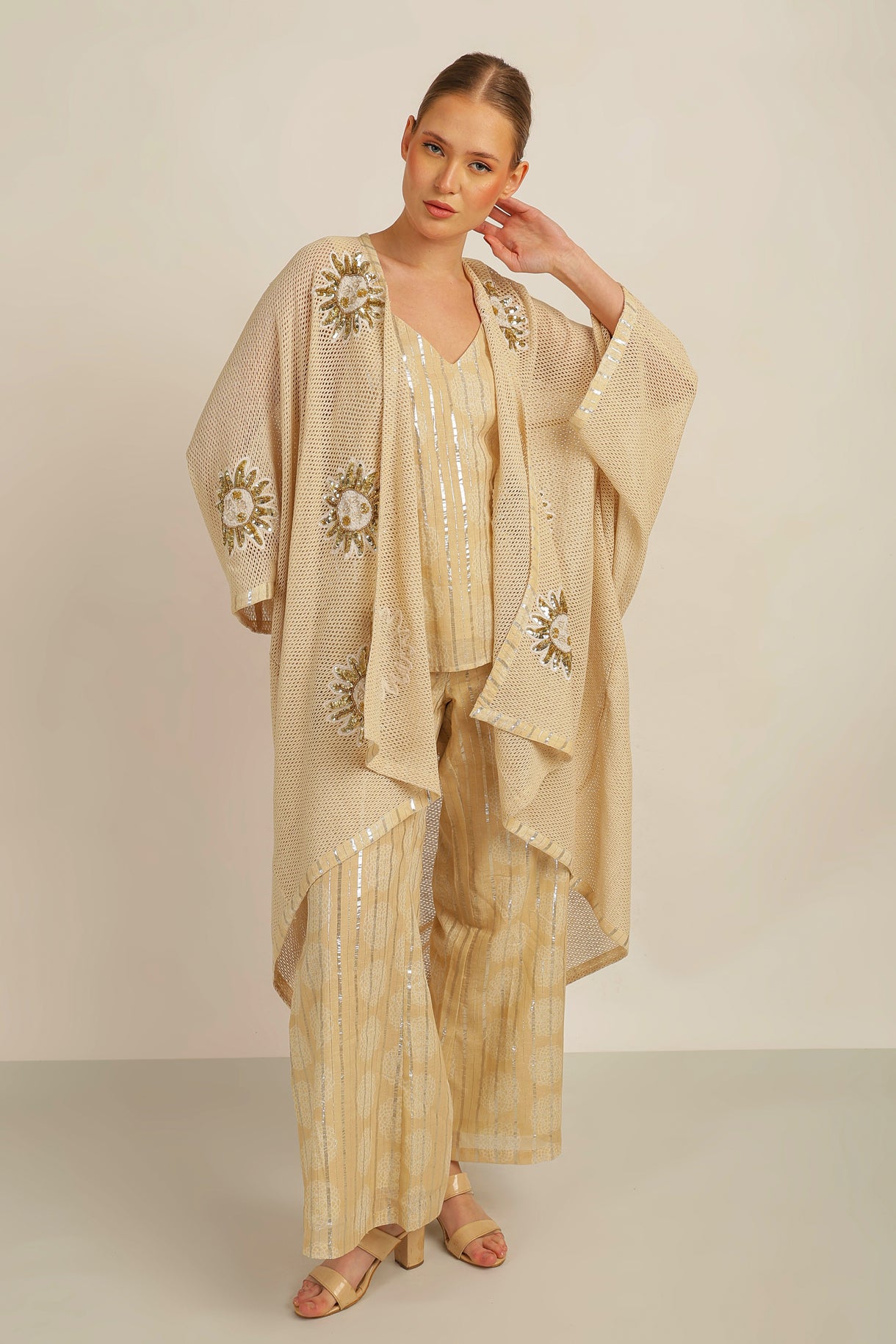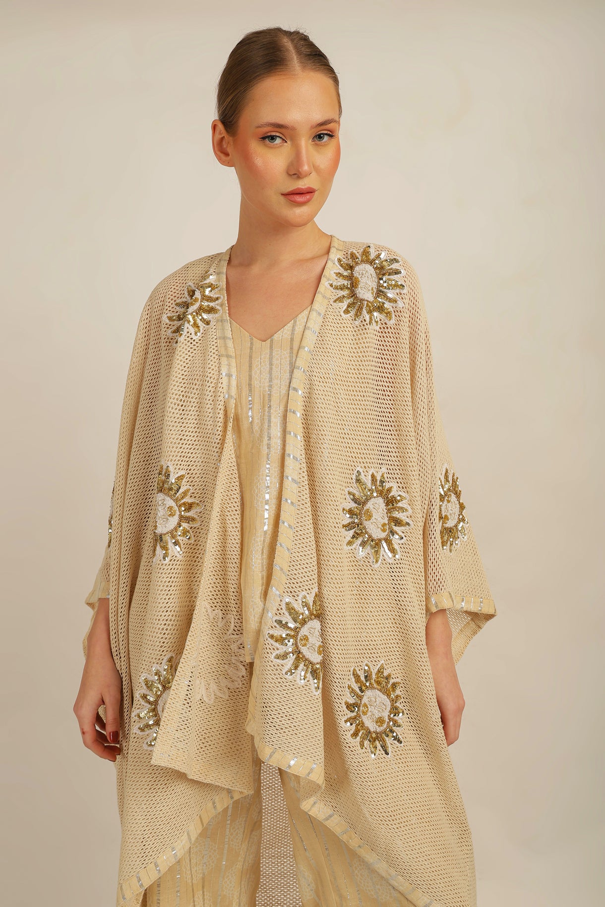 Elevate your style with the SUN KIMONO. This stunning kimono cape is made of luxurious netting material with delicate lurex fabric trimming. Hand-sewn sequin and embroidered sun motifs add a touch of glamour to this versatile piece. Perfect for any occasion, bring out your inner goddess with the SUN KIMONO.