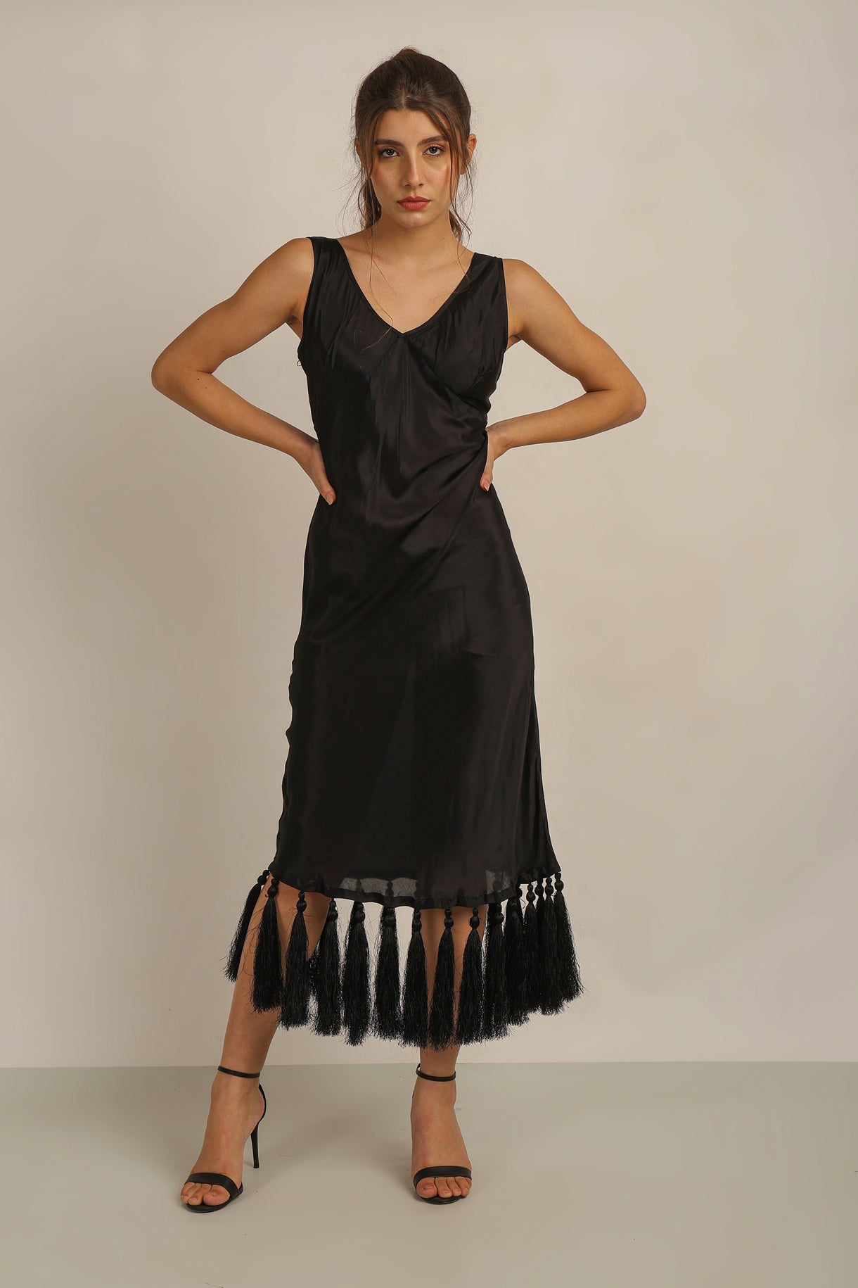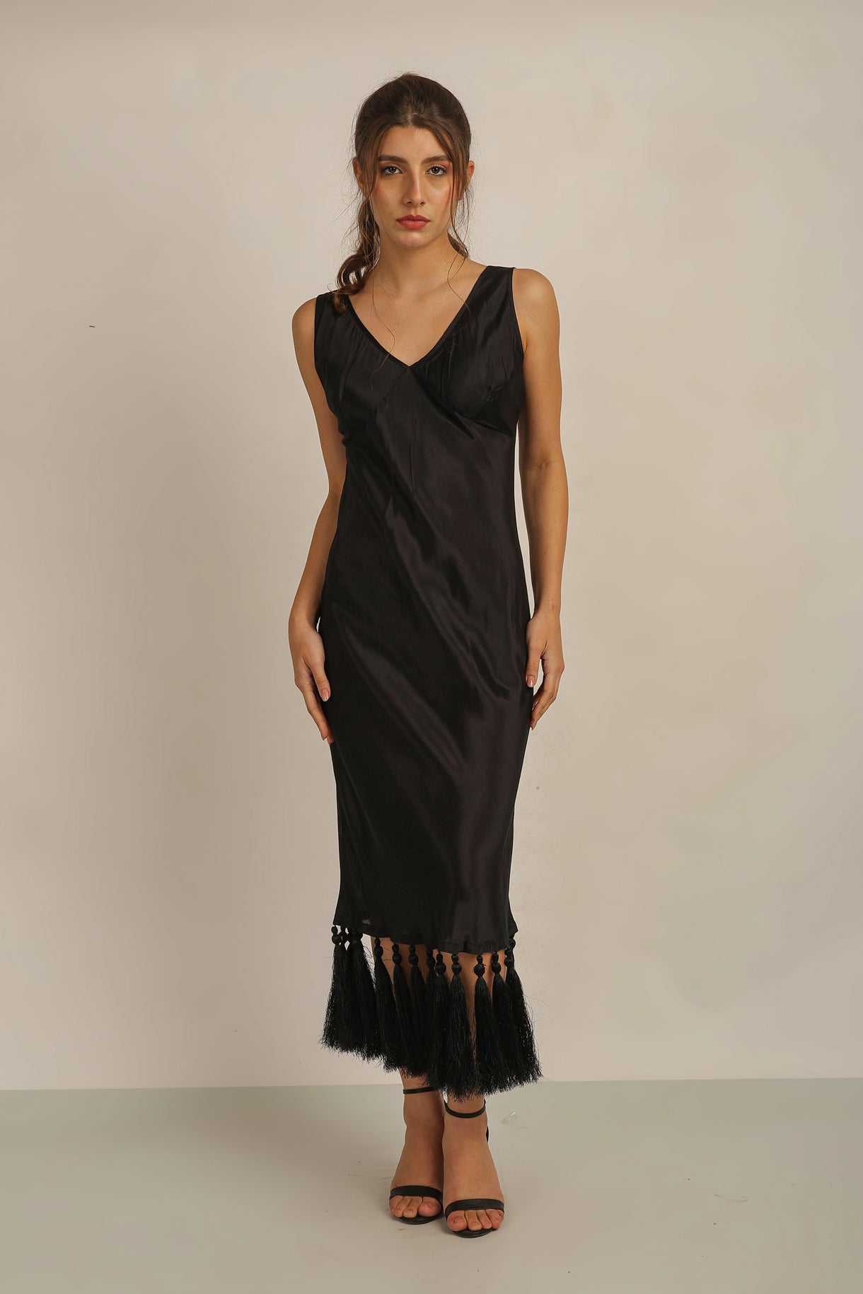 The ZAZA TASSEL DRESS BLACK is sure to amaze with its stunning tassels and bias cut, creating a flawless silhouette. Made with quality material and expert craftsmanship, this dress is perfect for that special  occasion. Experience the drama and elegance of the ZAZA TASSEL DRESS BLACK.