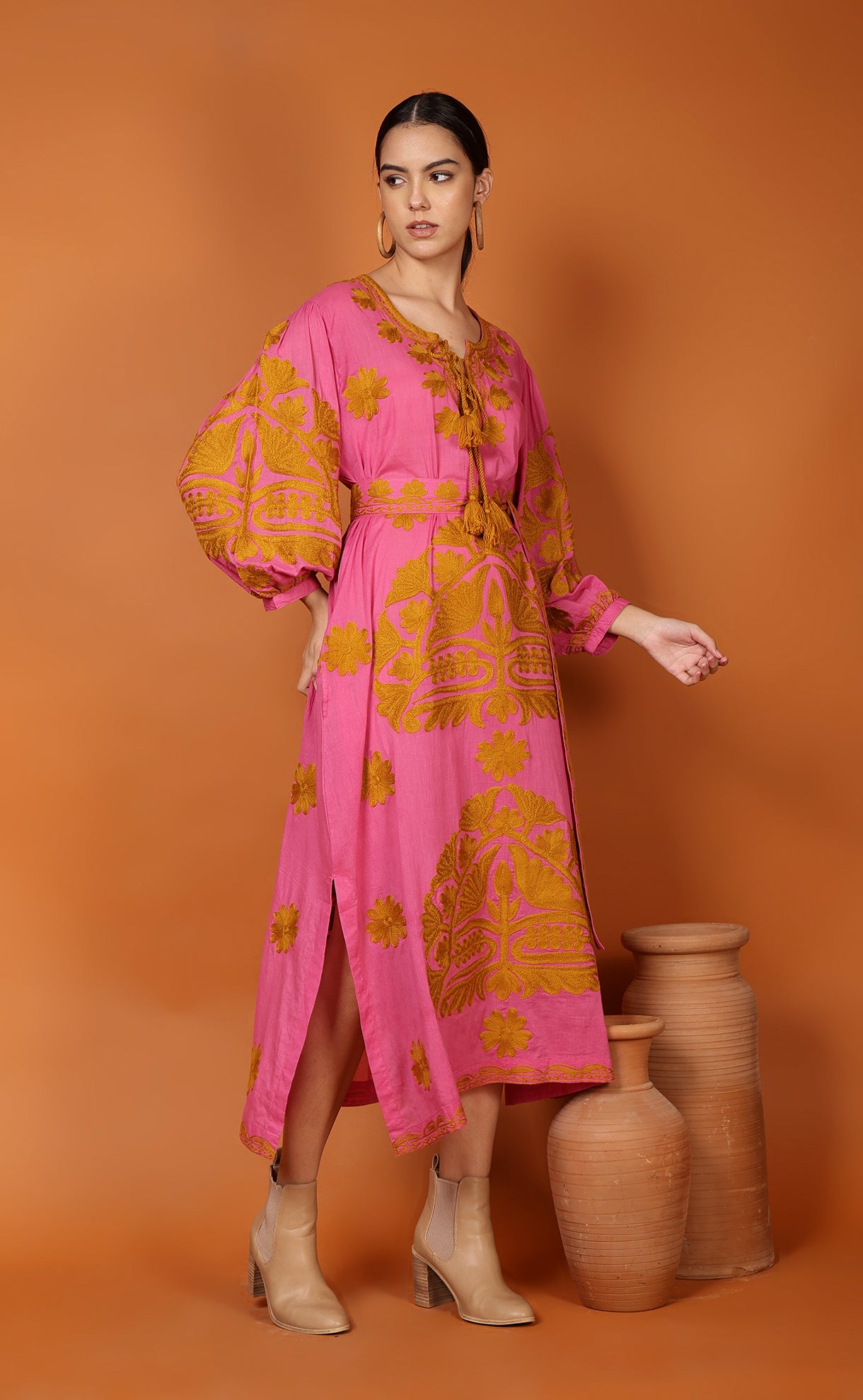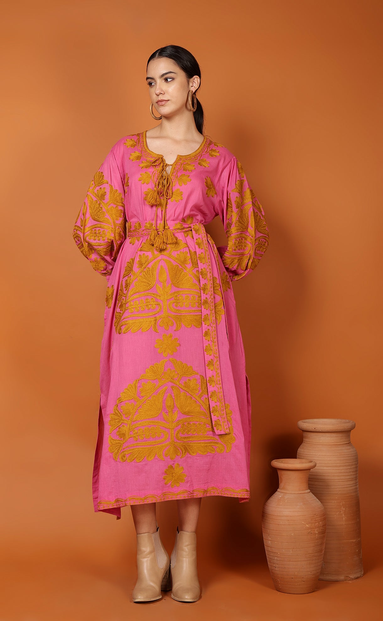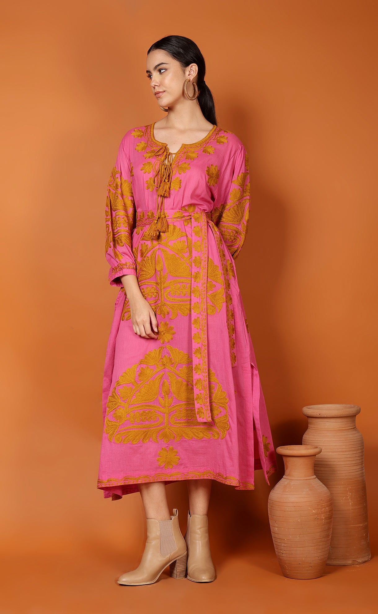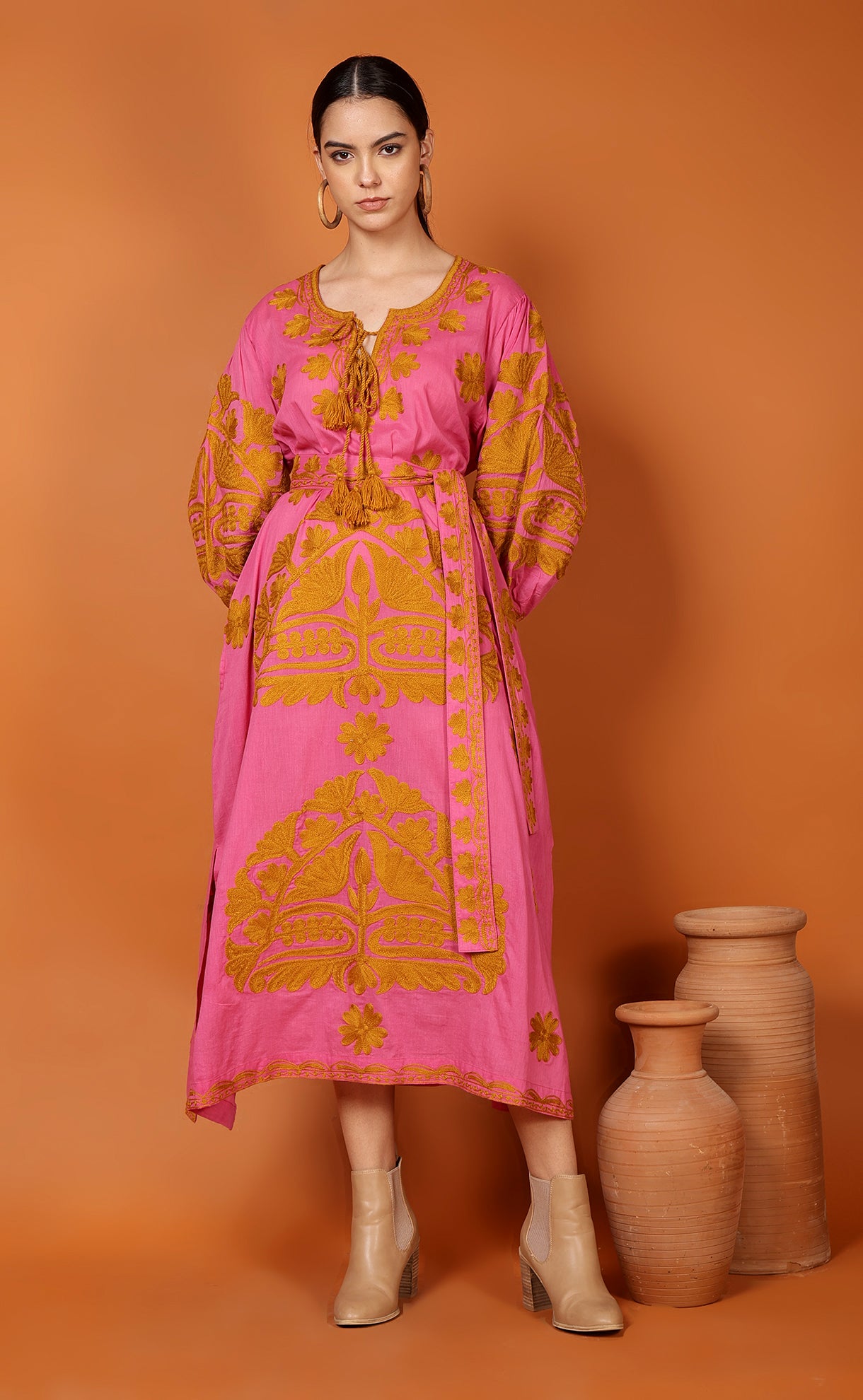 The ADELE DRESS in pink offers a fully lined design, featuring intricate Aari embroidery that enhances its aesthetic appeal. The combination of hot pink and copper tones creates a striking visual impact. With two front ties at the neckline and an embroidered sash belt, this dress provides an easy style that ensures comfort and versatility for various occasions.