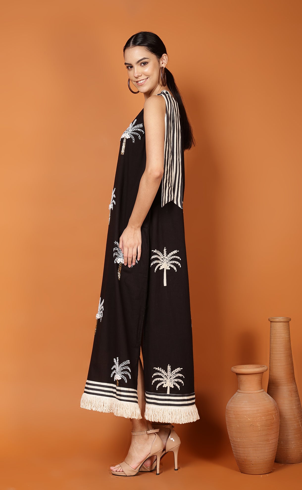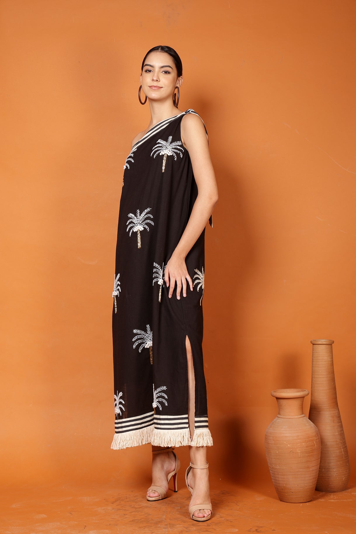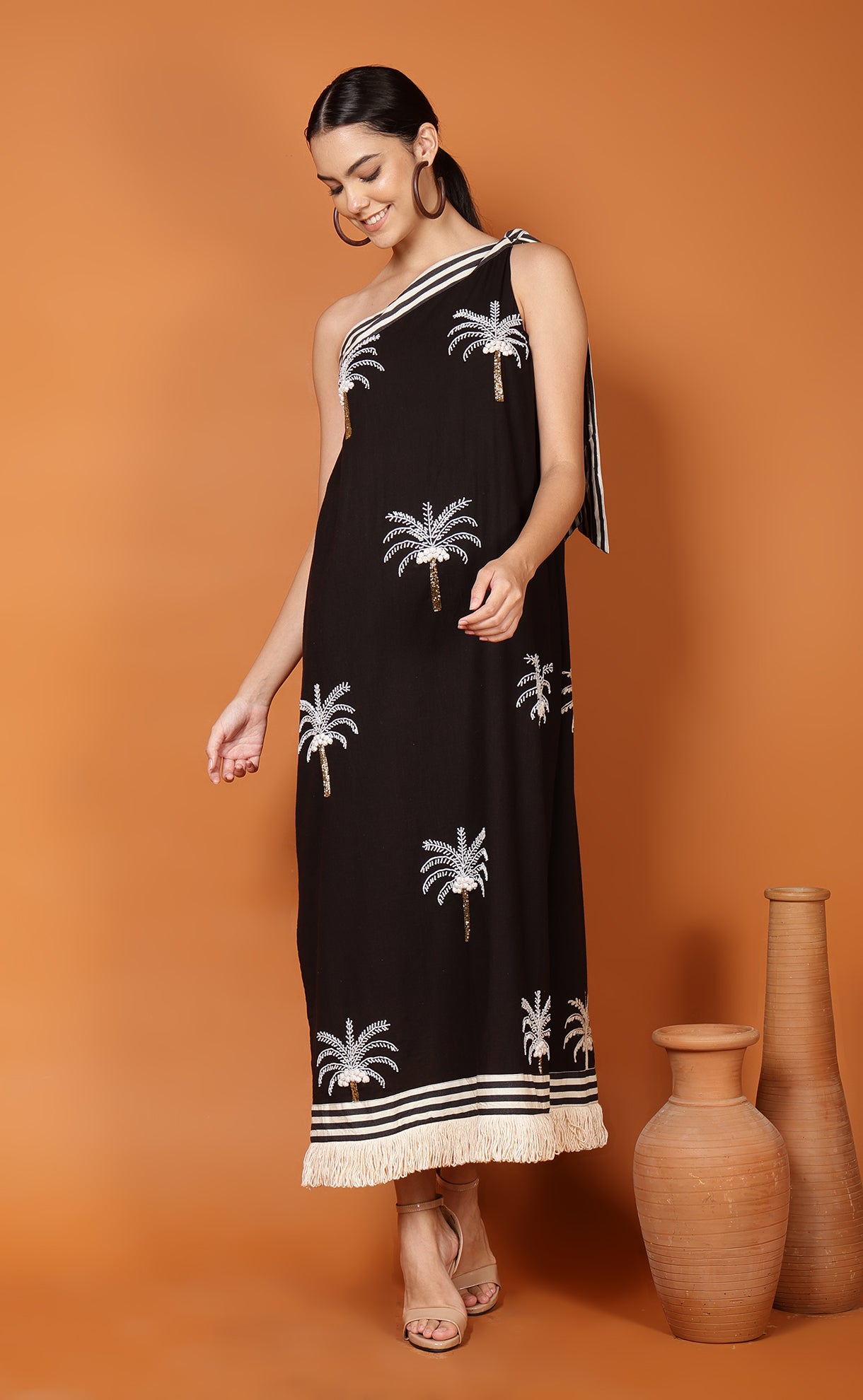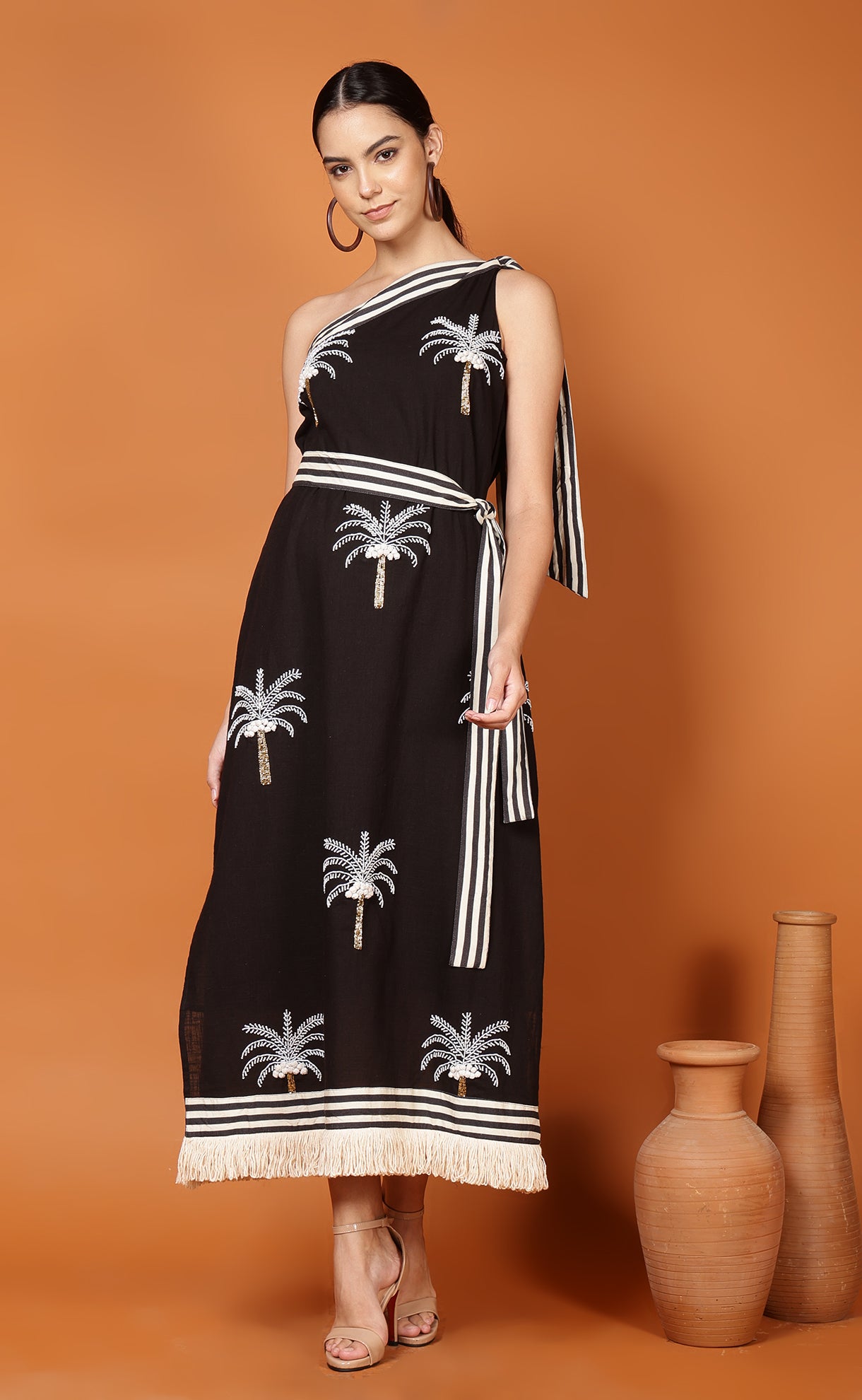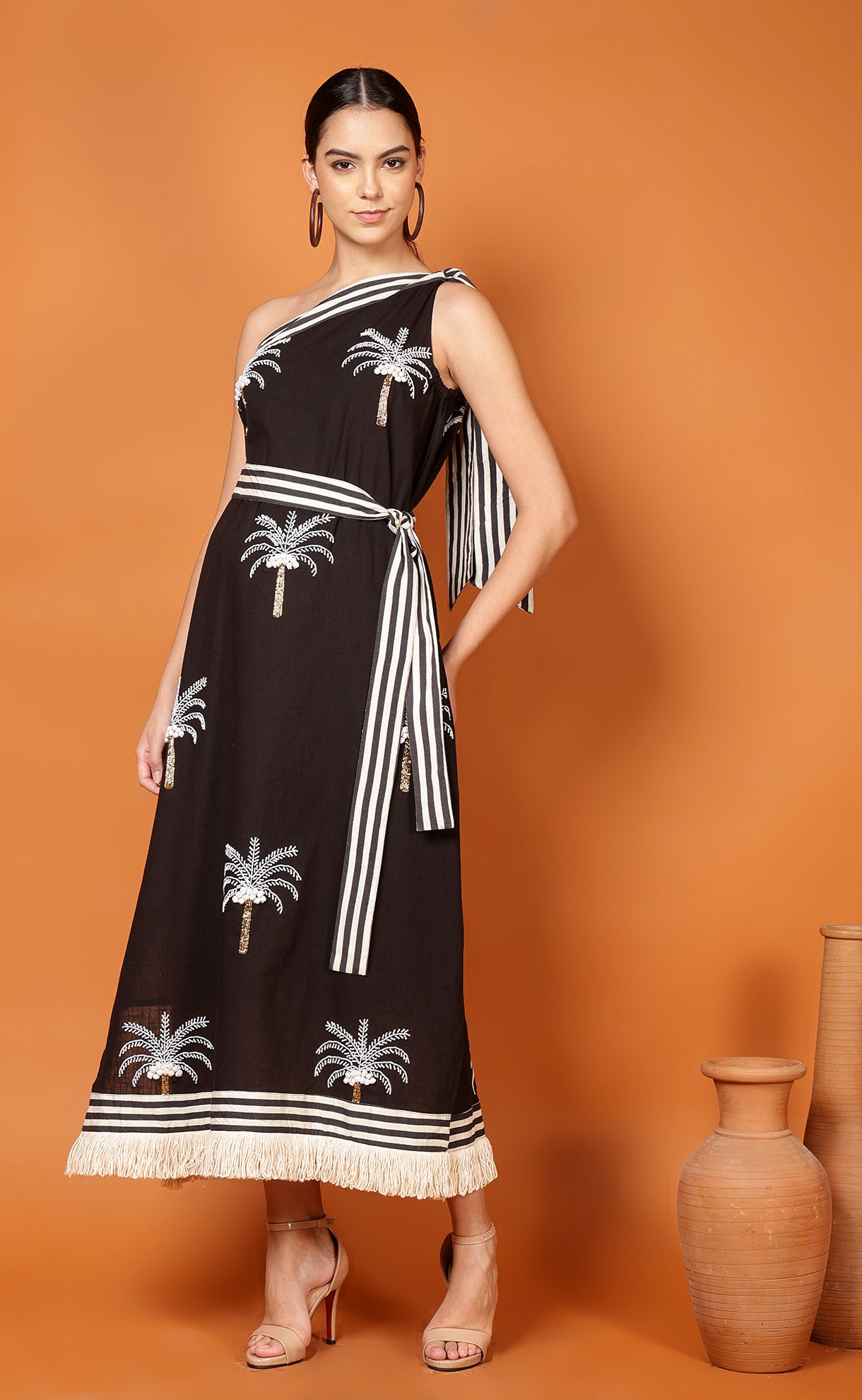 The Dubai Palm One Shoulder Dress combines contemporary elegance with intricate artisanal detail. Striking black and white stripes create dynamic contrast throughout, while an exquisite palm tree motif adorns the bodice in traditional aari embroidery and bronze beading. The asymmetrical one-shoulder silhouette offers a modern edge, and the optional sash belt allows you to customize your look. Perfect for evening events or upscale occasions, this piece merges global inspiration with refined craftsmanship.