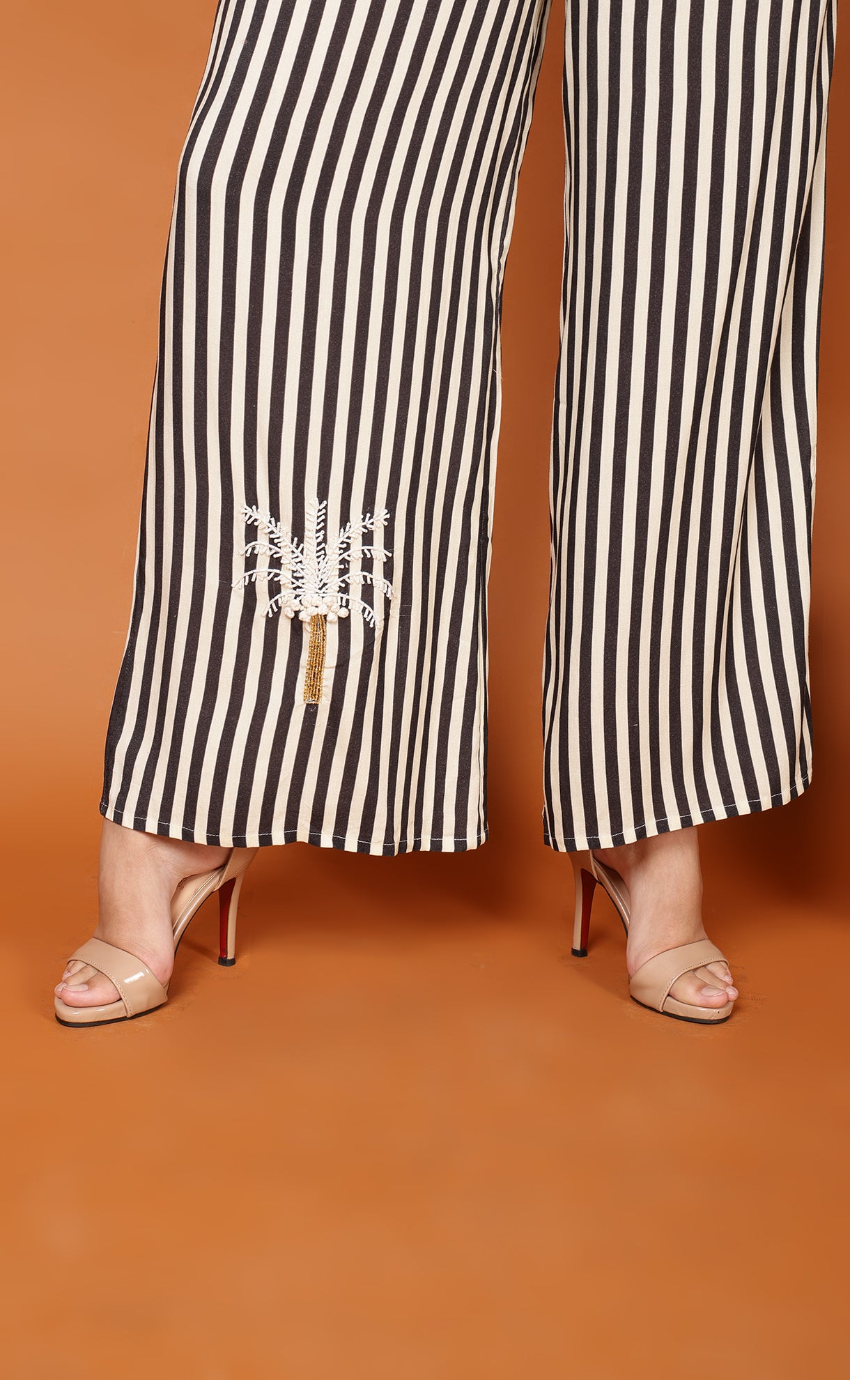 Elevate your wardrobe with these refined palazzo pants, featuring an elasticated waist for effortless comfort and functional pockets. The design showcases an exquisite embroidered palm motif crafted with traditional aari embroidery, complemented by delicate sequin detailing just above the hem for a touch of understated glamour.