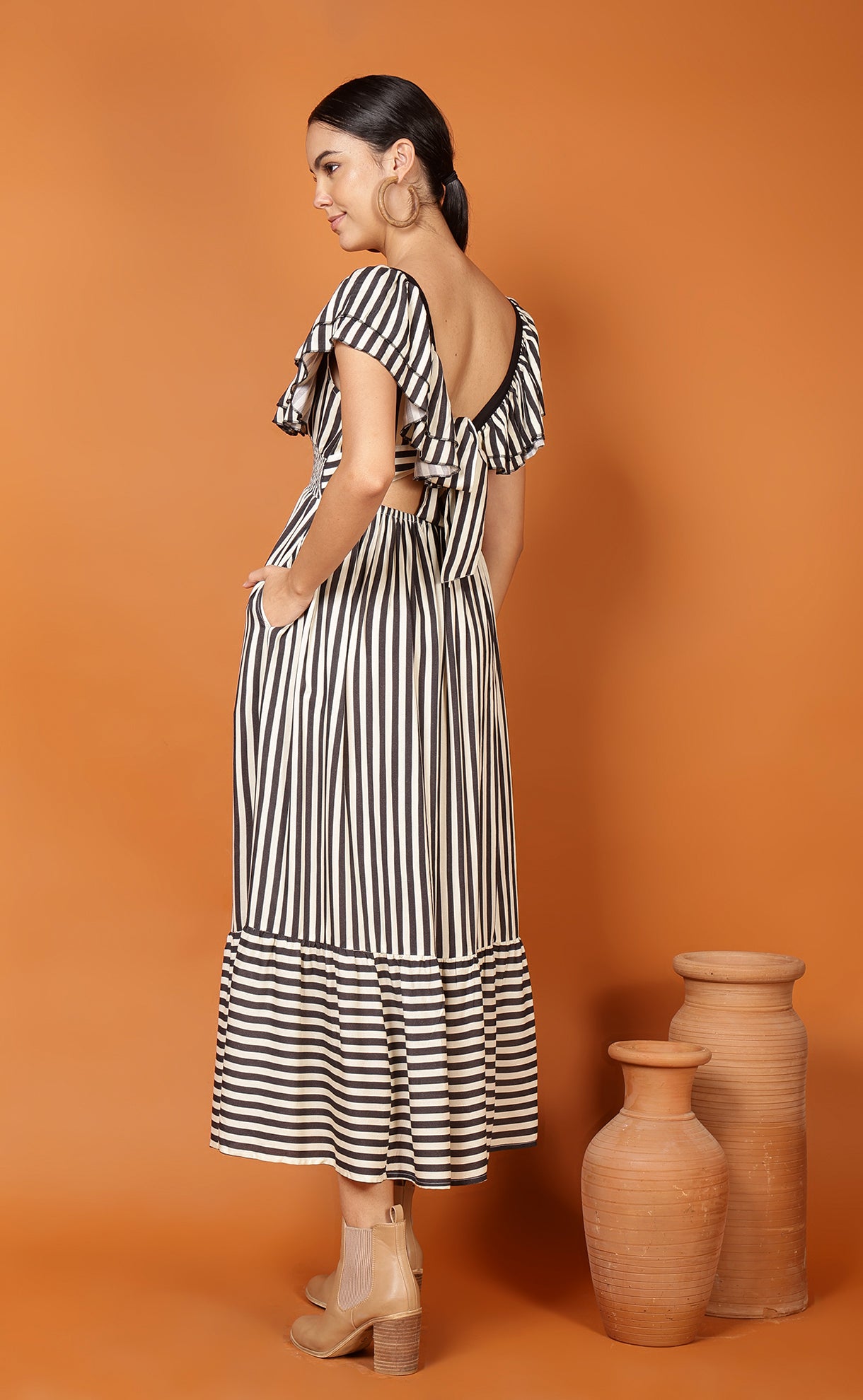 Elevate your wardrobe with this sophisticated striped midi dress, featuring charming black and white stripes that command attention. The playful frill detailing adds movement and dimension, while the cinched shirred waist creates a flattering silhouette. An elasticated back with adjustable tie ensures a comfortable, customizable fit for all-day wear. Perfect for occasions that call for understated elegance with a touch of contemporary flair.