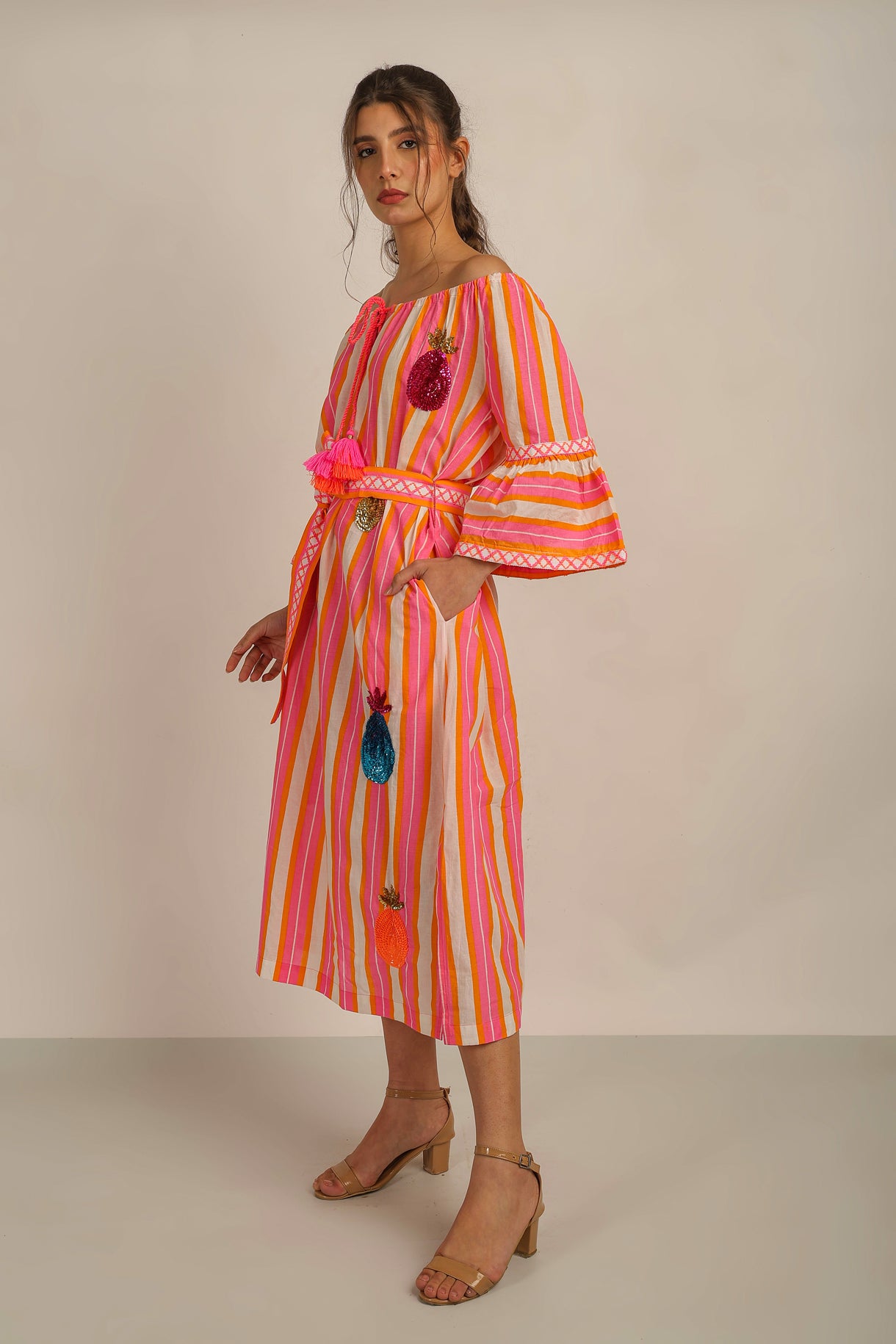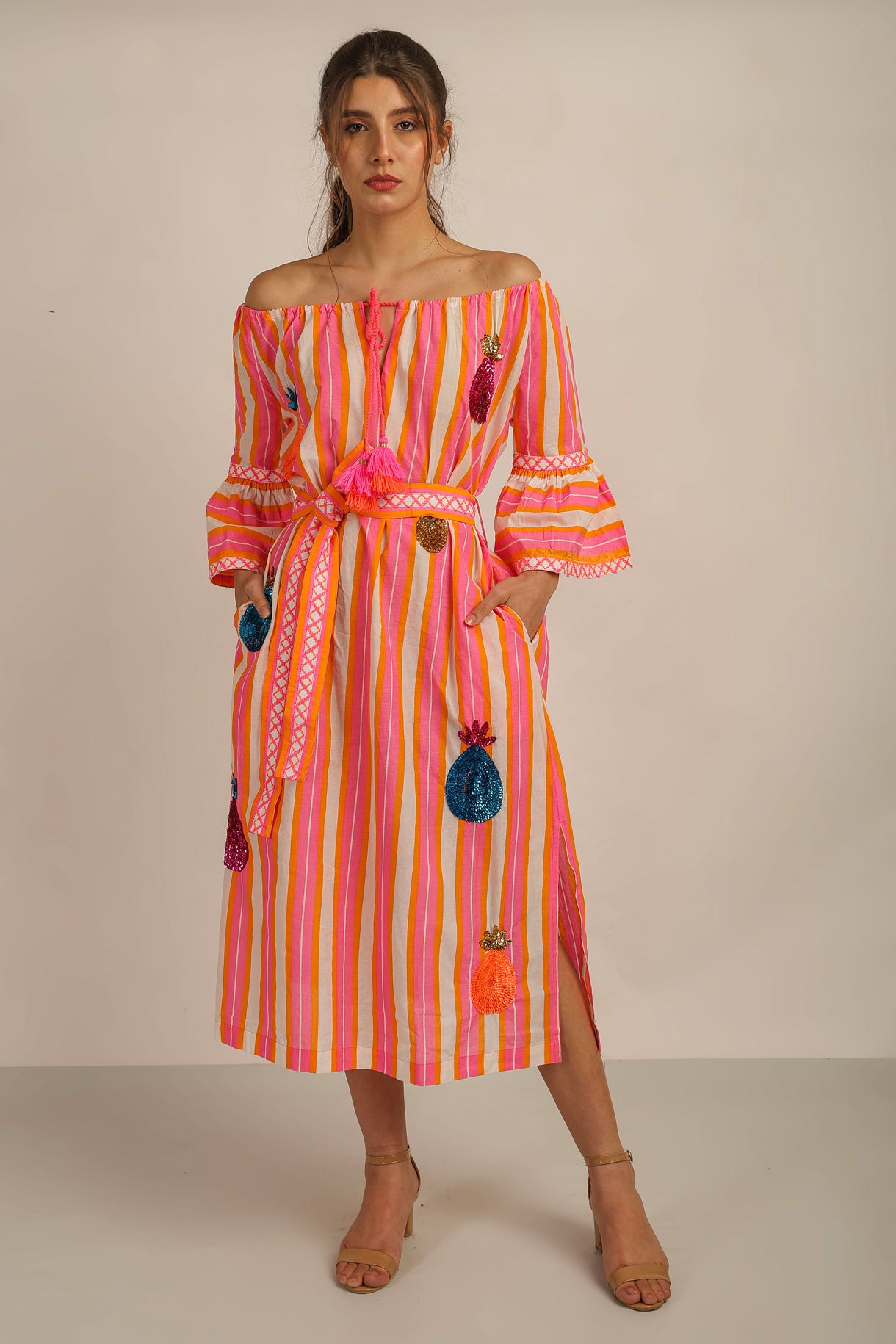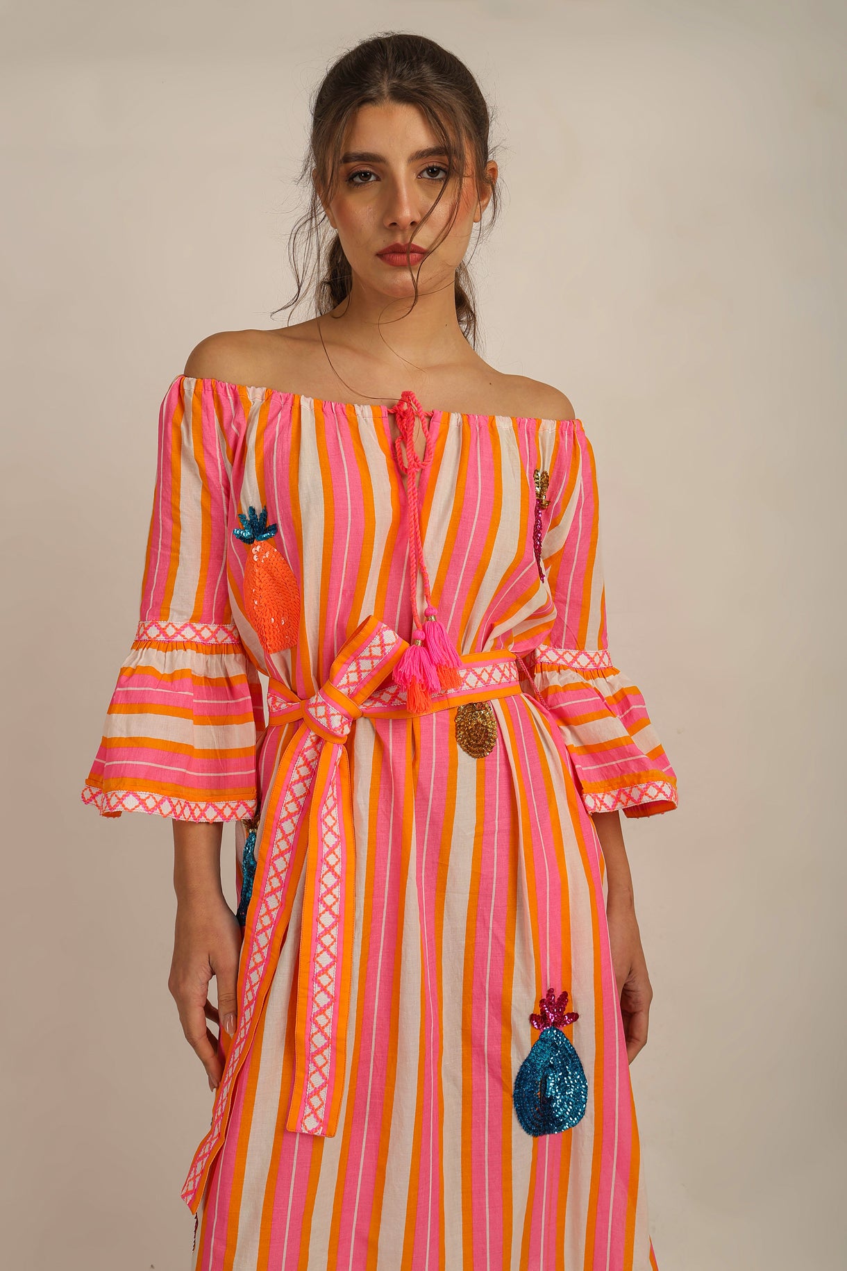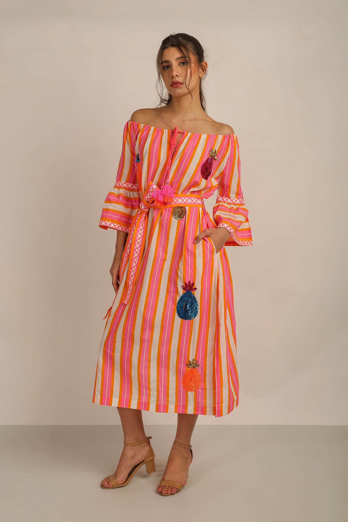 Effortlessly chic, the MALTA OFFSHOULDER DRESS combines comfort and style. Made from a vibrant, cotton striped fabric, this dress features an off-shoulder design and is beautifully embellished with sequin pineapples. Perfect for any occasion, elevate your wardrobe with this fun and fashionable piece.