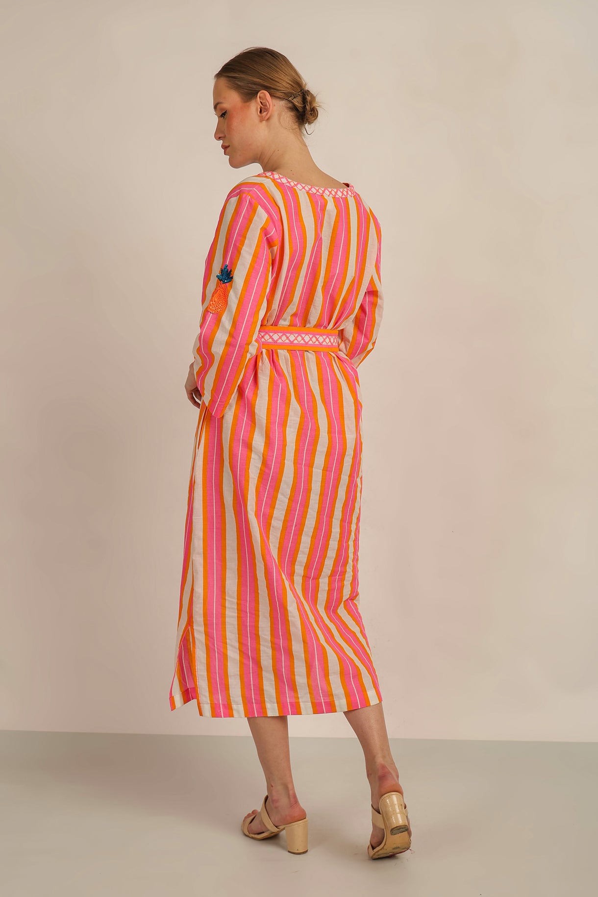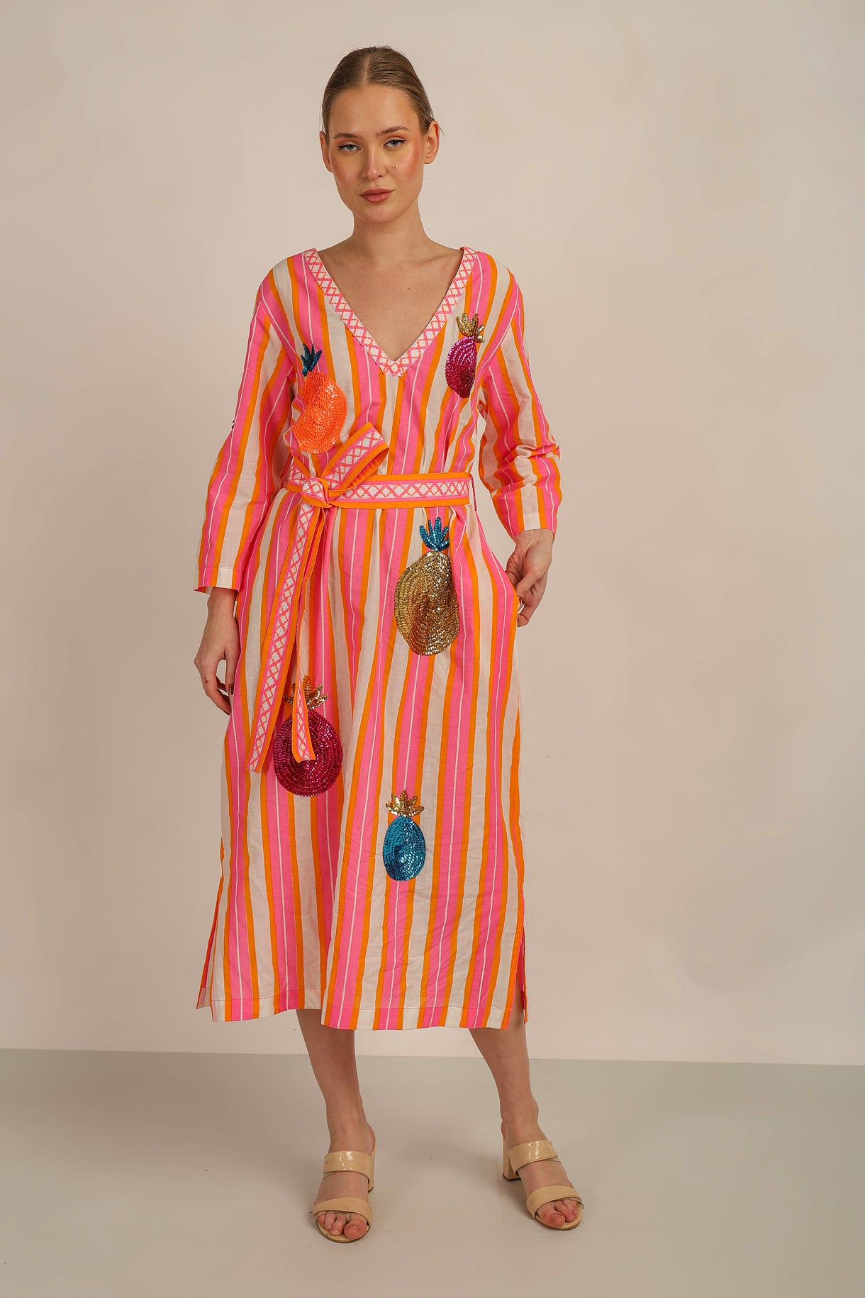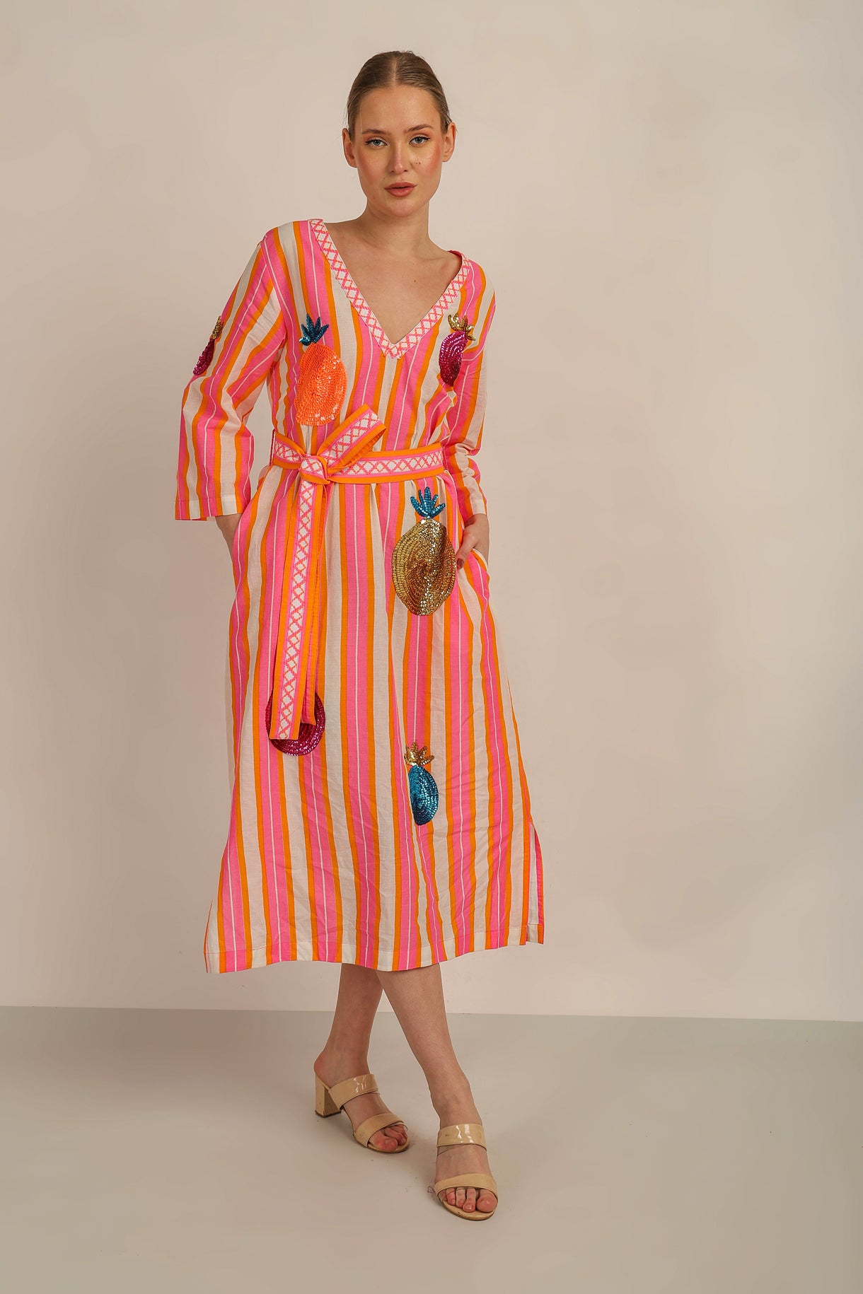 Introducing the MALTA STRIPES MIDI DRESS - easy shapes, easy style, no fuss dressing! The sequin motifs in pineapple shape add a touch of quirkiness, making it a truly one-of-a-kind piece. Perfect for those who like to keep it simple with a dash of fun!